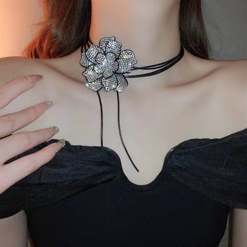 Retro elegant exaggerated Diamond-embedded large flower leather rope necklace Women's Light luxury high-grade sexy free knotted necklace accessories