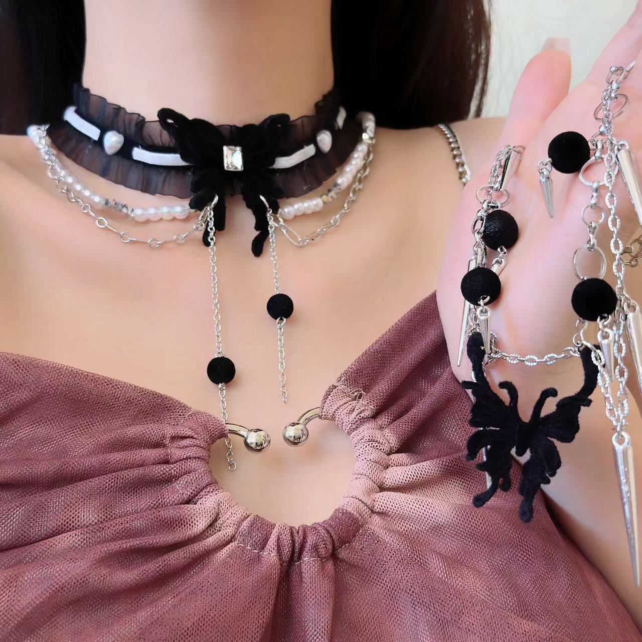 Diablo Spice Lace Pearl Flocking Butterfly Tassel Water Drop Collar Sexy Elegant Neck Strap Short Clavicle Necklace