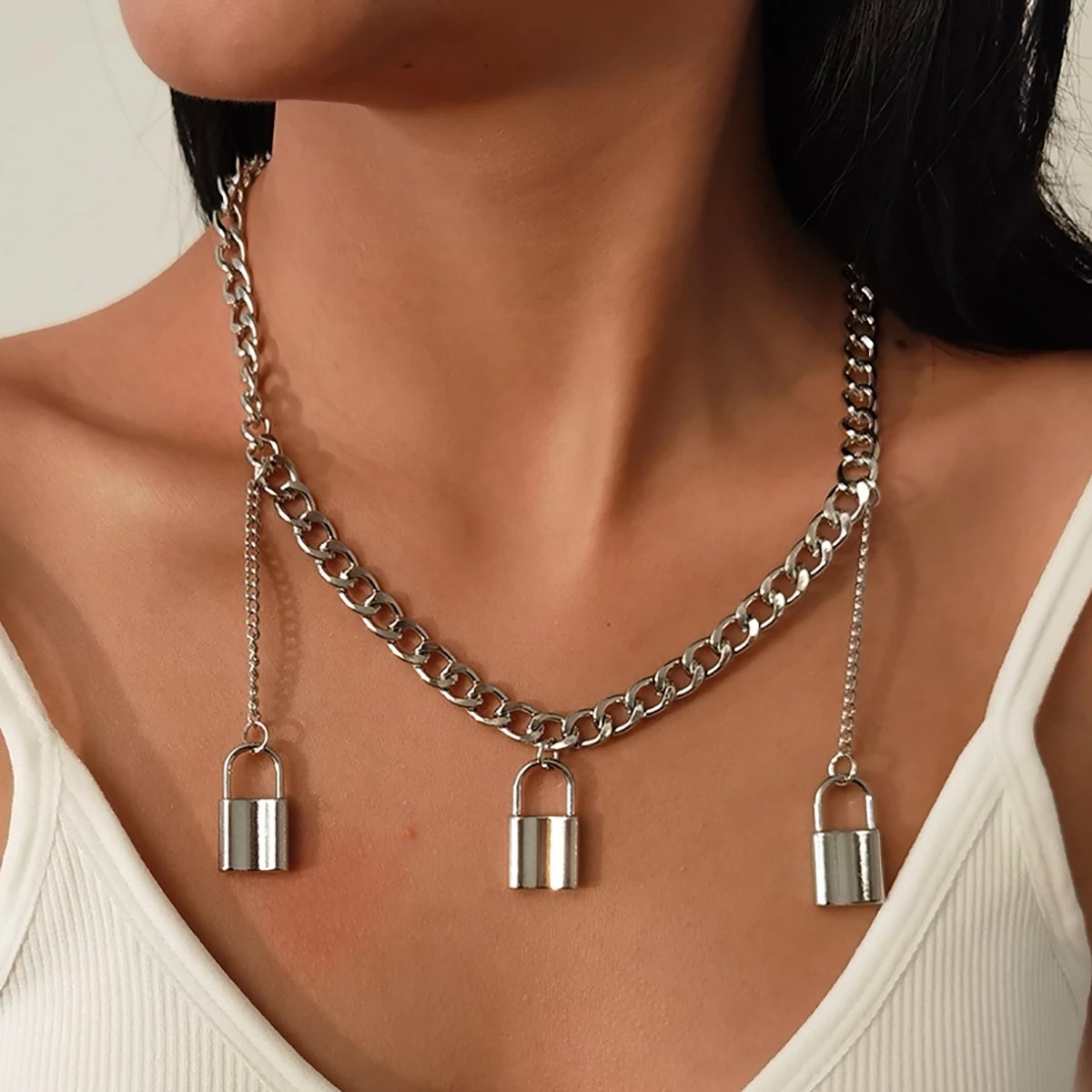 Punk Gothic Cuban Necklace Lover 3 Lock Pendant Collarbone Chain Retro Sexy Padlock Tassel Fashion Necklace