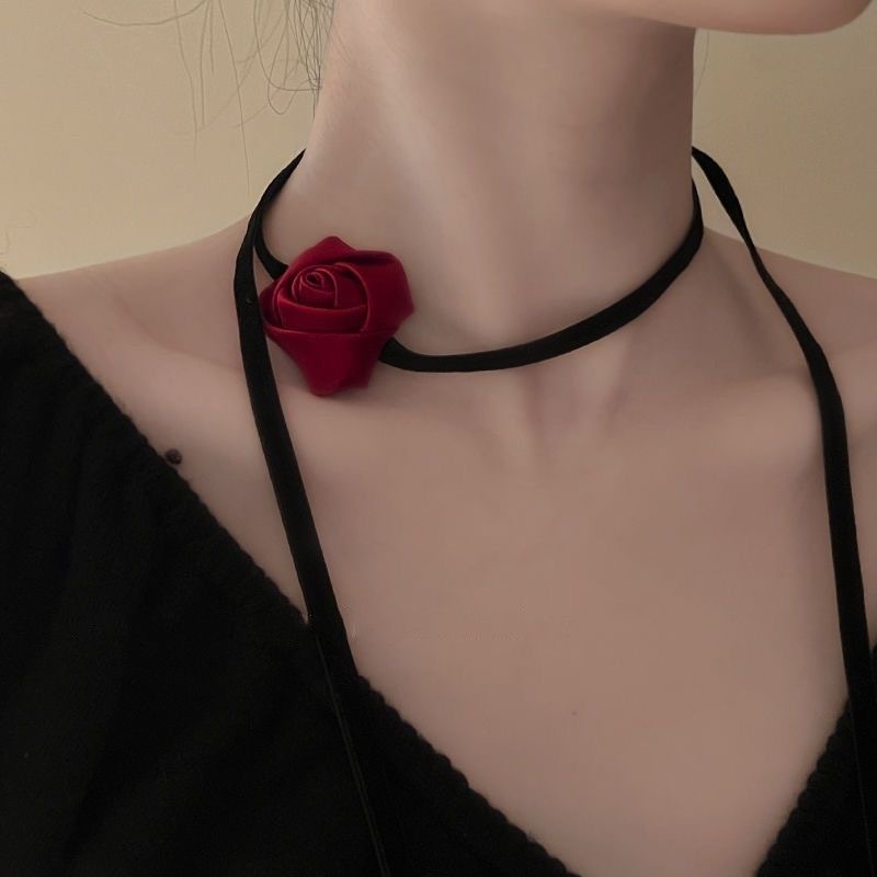 Vintage Rose necklace wine red velvet strap choker fashionable court three-dimensional necklace sexy niche women