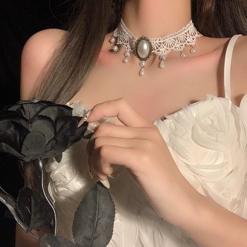 Lace Collar Pearl Pendant Choker Dark High-end Clavicle Necklace Sexy French Retro Short Neck Strap