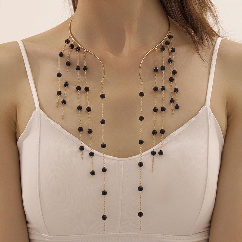 European and American Cross-Border Jewelry Exaggerated Sexy Long Black Tassel Ethnic Style Collar Open Imitation Pearl Necklace