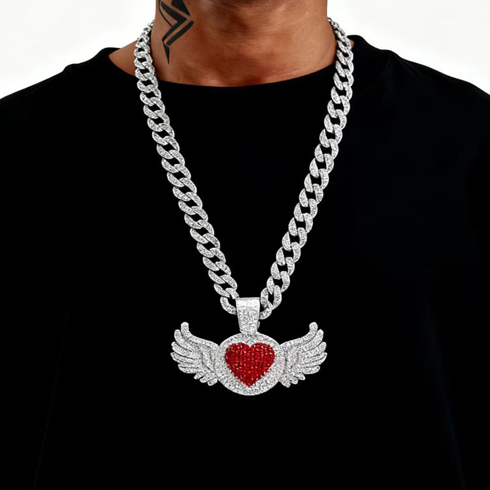 Hip-Hop Necklace Pink Heart Pendant Sexy Temperament Clavicle Chain Alloy Full Diamond Cuban Chain Necklace Cross-Border Wholesale