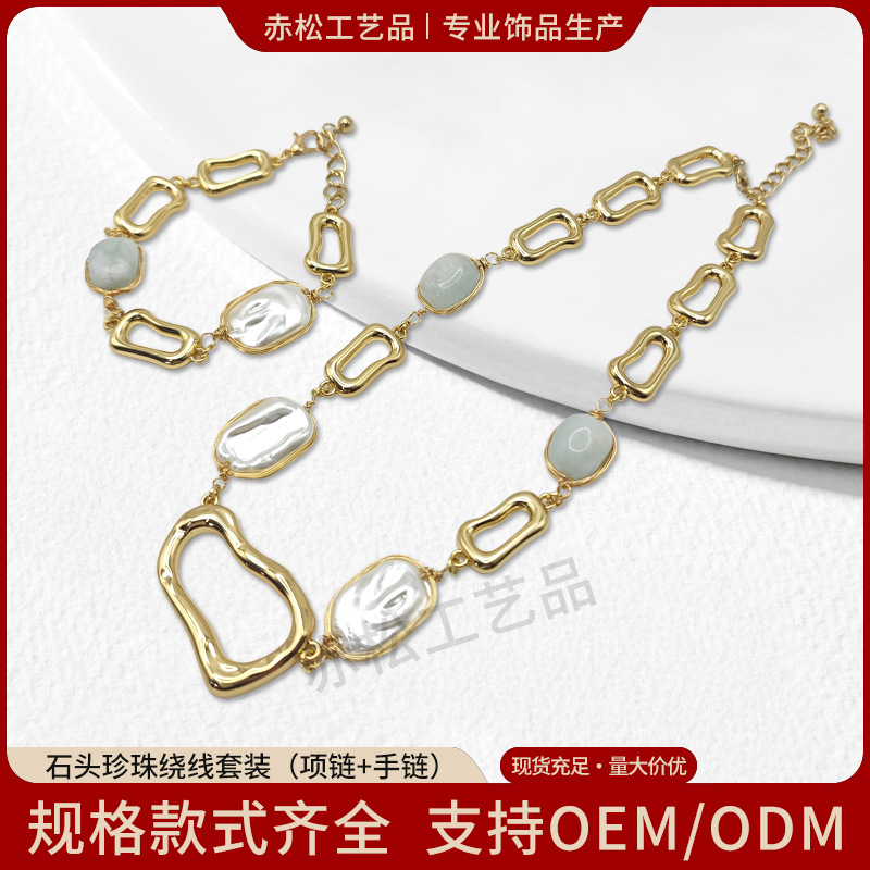 Customized Stone Pearl Wire-Wrapped Necklace Bracelet Set Sexy Clavicle Chain Niche Ins Bracelet Amazonite Jewelry