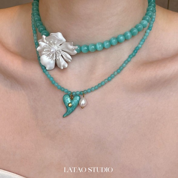 Flower Heart Mint Green Beaded Necklace Female Sexy Style Fashion Sexy Niche Versatile Design Stacked Necklace