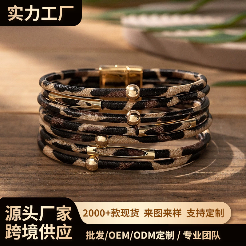 Cross-Border Sexy Leopard Print Magnetic Buckle Bracelet Manufacturer Customized Ins Style Design Sweet and Cool Exaggerated Pu Leather Bracelet Trend