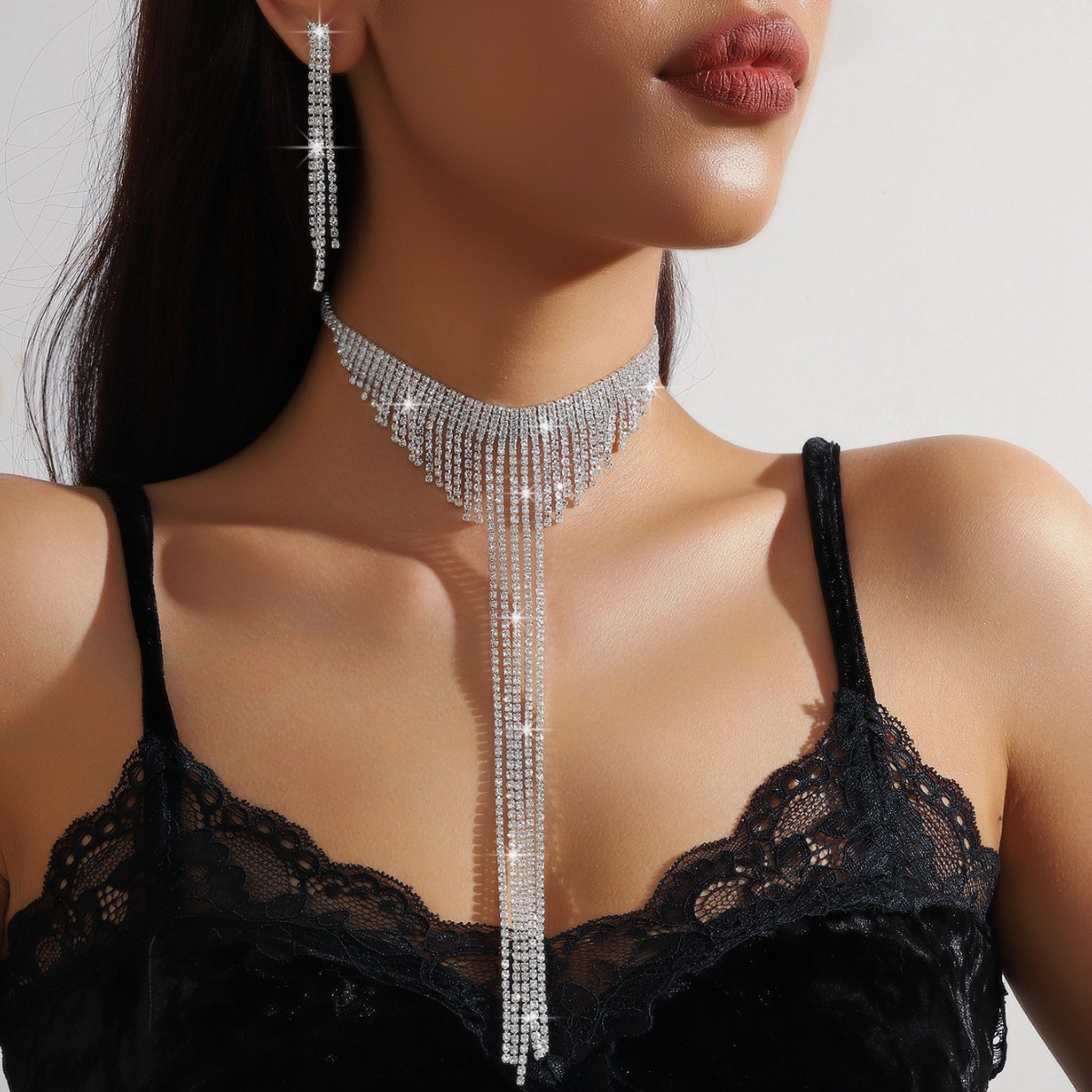 Factory Direct Supply European and American Fashion Light Luxury Rhinestone Tassel Necklace Sexy Full Diamond Claw Chain Long Exaggerated Collarbone Necklace