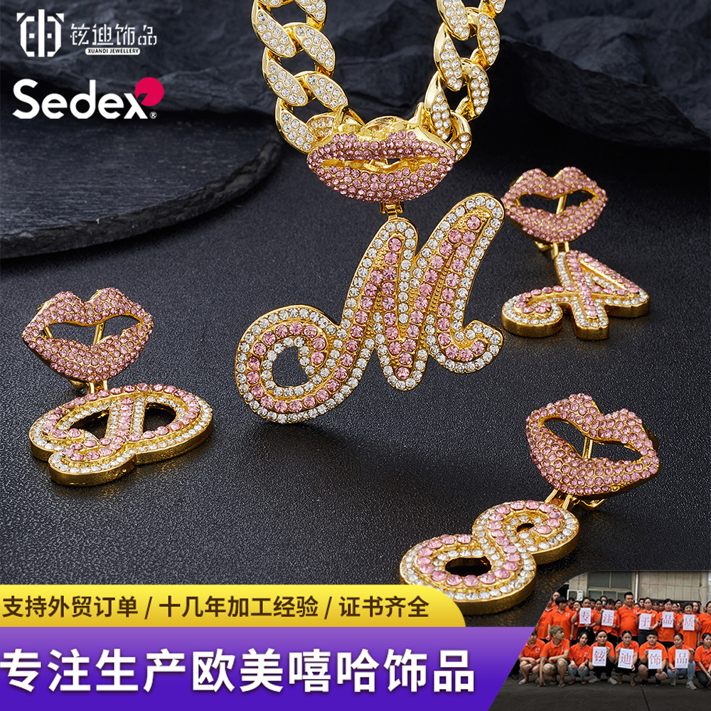 Europe and the United States street 26 letters pendant hip-hop personality diamond Cuban necklace sexy mouth letter jewelry wholesale