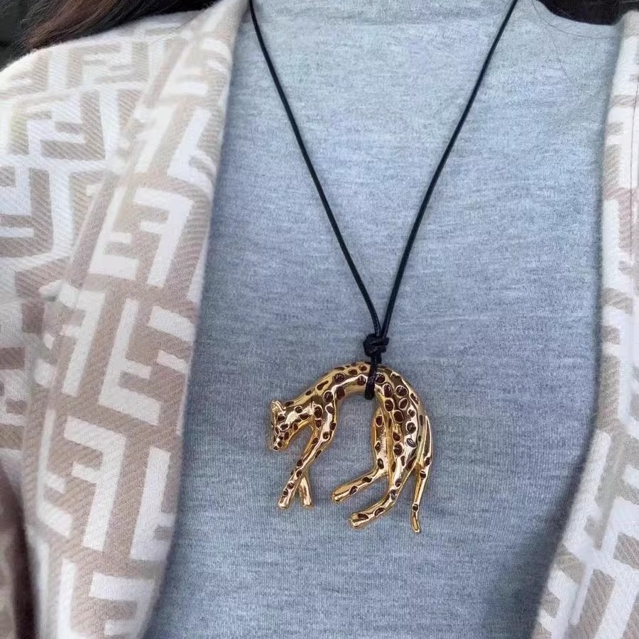 Trendy Unique Sexy Coffee-Colored Leopard Pendant Necklace for Women, Vintage Style Leather Cord Long Sweater Chain Accessory for Hot Girls