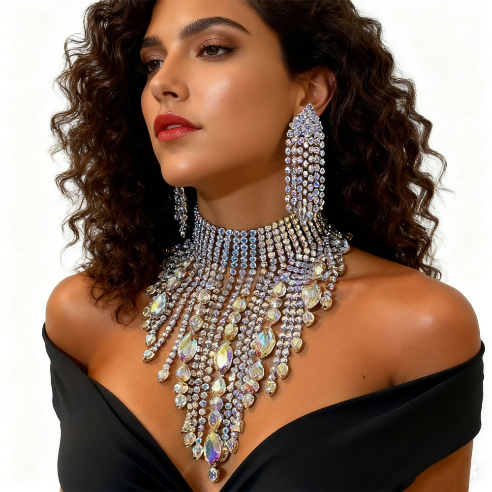 European and American Sexy Exaggerated Necklace Tassel Earrings Aliexpress Hot Selling Rhinestone Necklace Set Women Jewelry Set