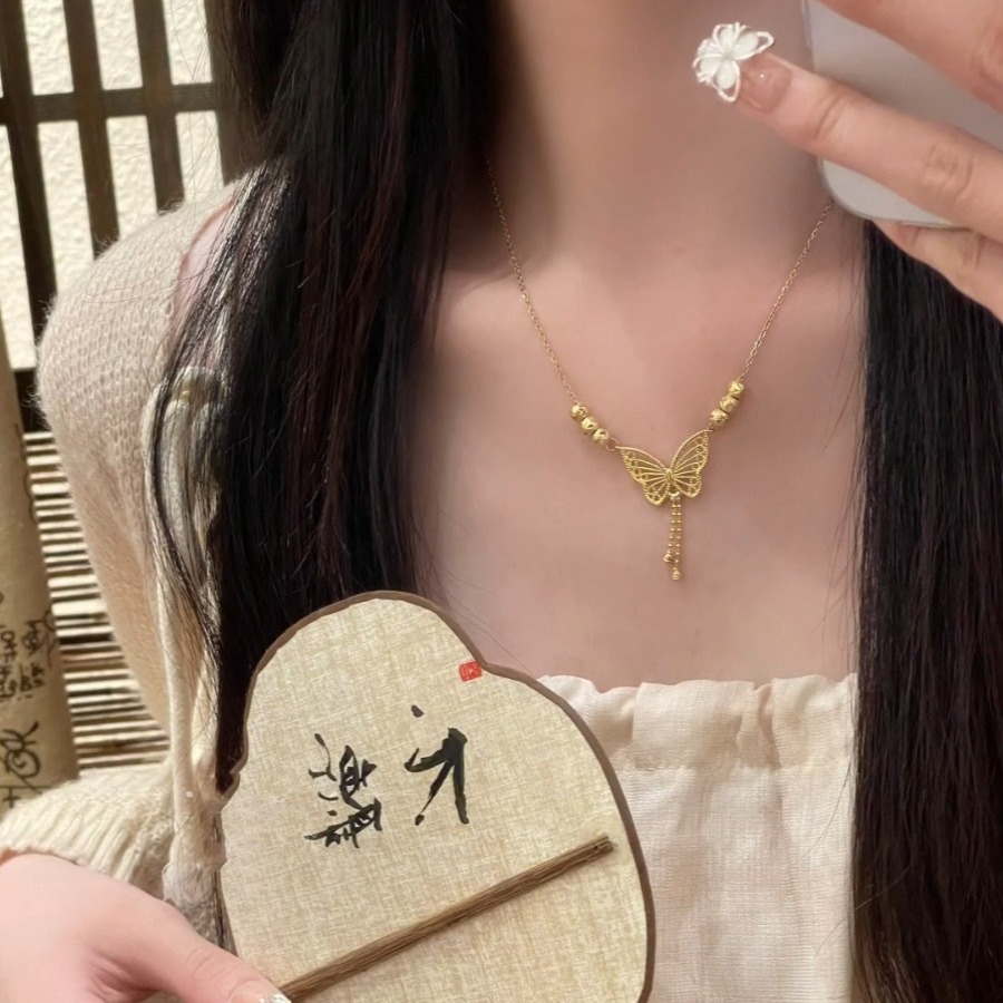 Copper Plated Gold Pendant Micro-inlay Sexy All-match Light Luxury Beads Butterfly Tassel Necklace Women's High-end Fashion Accessories