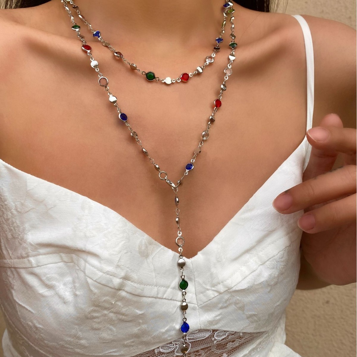 2-Piece Y-Shaped Chain Clavicle Chain Sexy European and American Style Necklace Set Random Color Stained Glass Heart Zircon