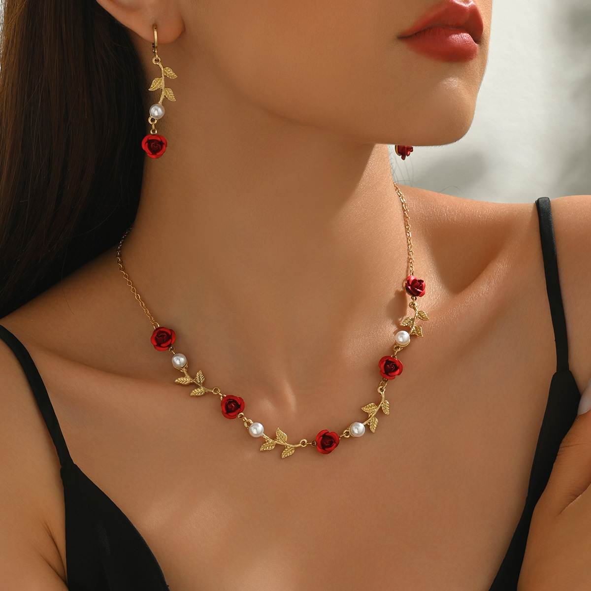 French Romantic Sexy Retro Rose Leaves Imitation Pearl Flower Stitching Clavicle Chain Earrings Valentine's Day Gift
