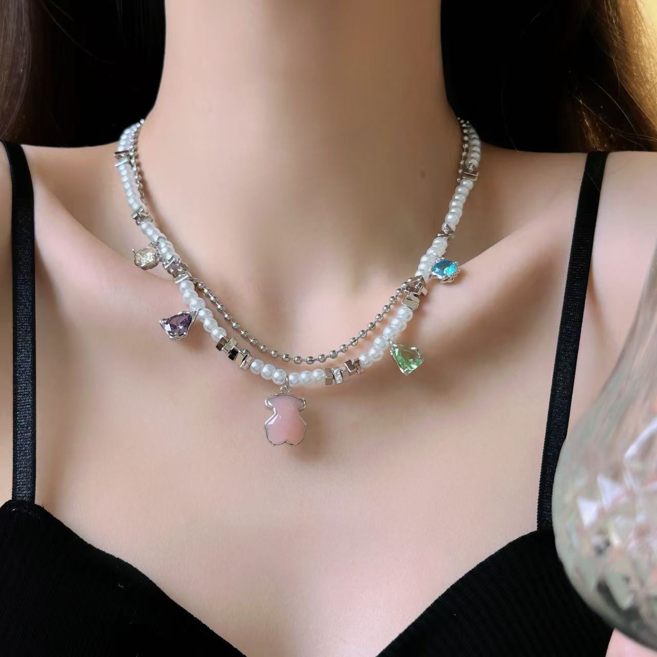 Sweet Temptation Double Layer Summer Color Zircon Love Bear Pearl Necklace Women's Light Luxury Niche Sweet Cool Collarbone Chain
