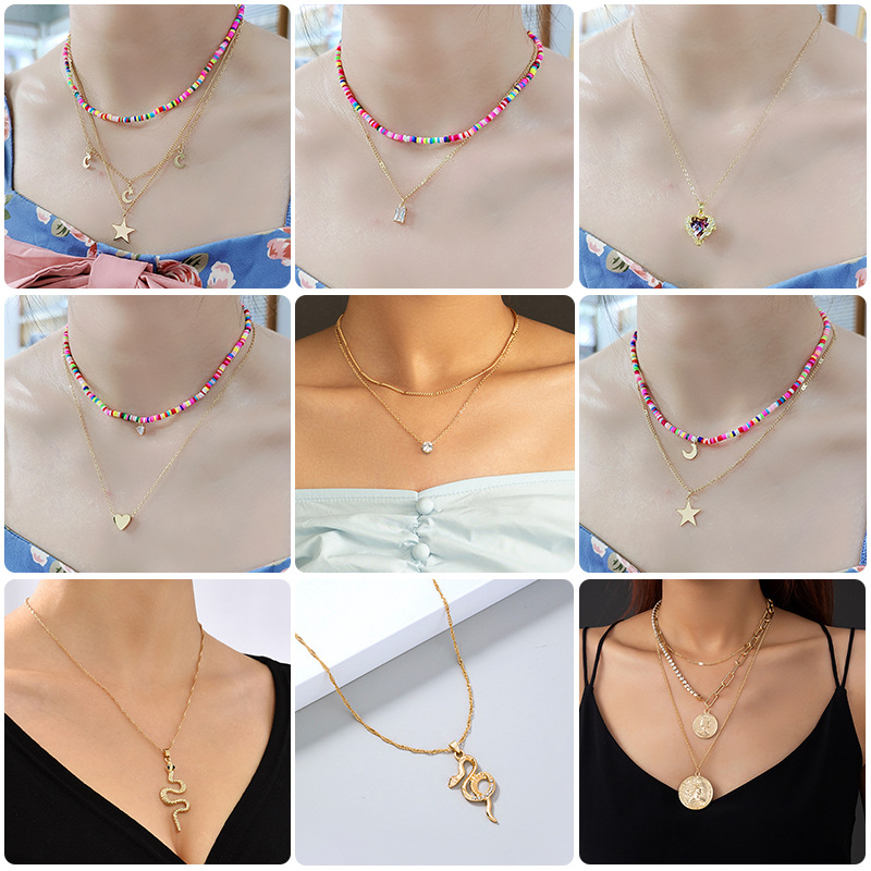 Personalized Retro Color Handmade Soft Pottery Multi-Layer Necklace Women's Snake Geometric Pendant Fashion Exaggerated Necklace