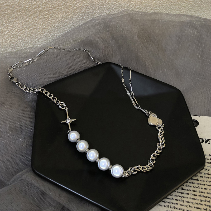 Niche Reflective Luminous Pearl Stitching Necklace Women's Hip-Hop INS Cold Split Fluorescent Cross Love Clavicle Chain