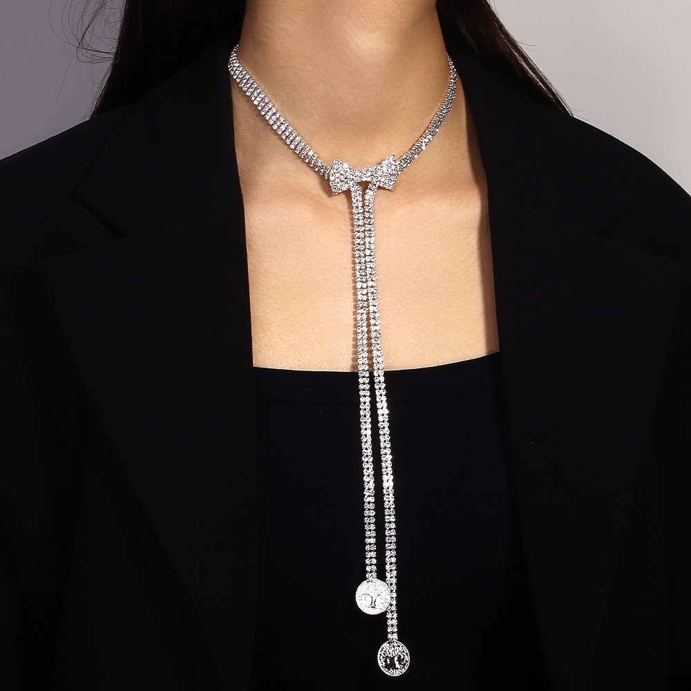 Foreign trade new rhinestone bow neck chain shiny sexy coin long tassel necklace jewelry necklace