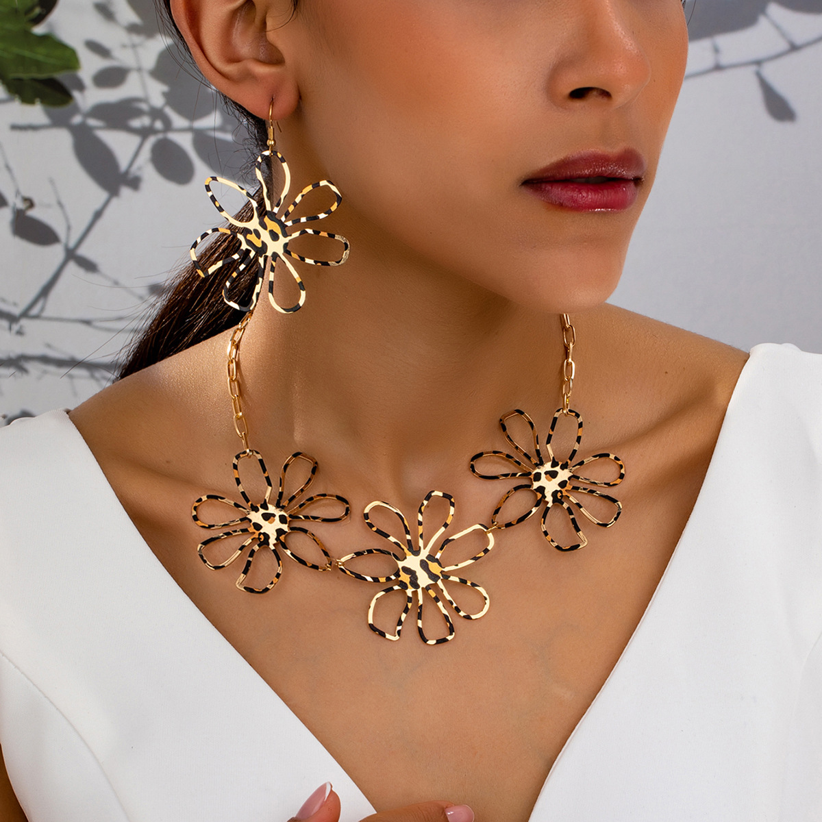 Amazon Cross-Border Hot Selling Jewelry Wholesale Fashion Sexy Leopard Print Hollow Flower Earrings Necklace Set for Women