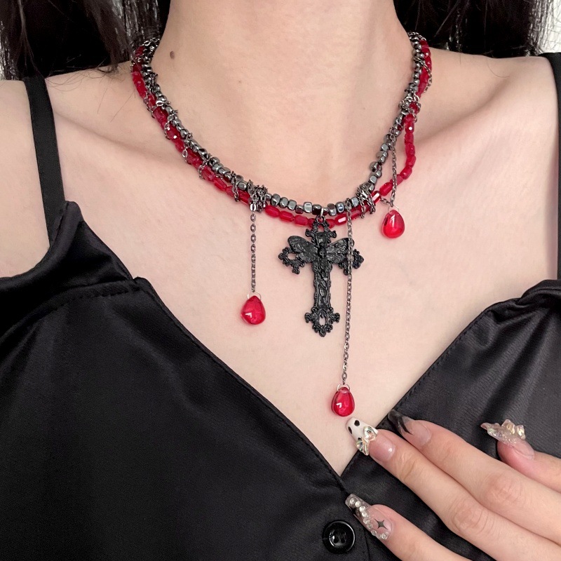 Dark Style Wings Cross Pendant Water Drops Tassel Clavicle Chain Fashion Light Luxury High Sense Sexy Spice Girl Necklace