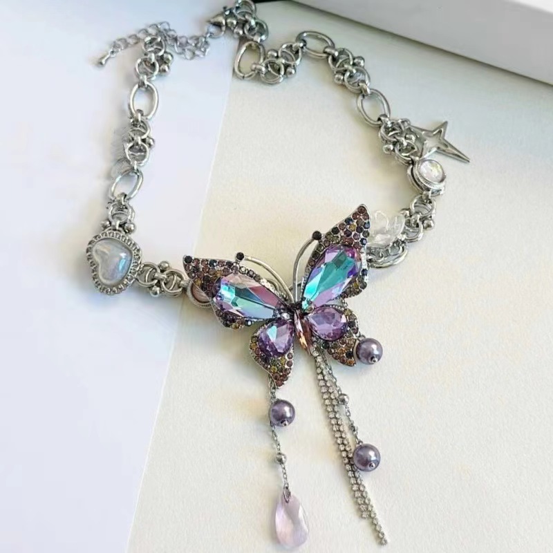 Sweet Cool Love Mang Star Super Flash Rhinestone Butterfly Tassel Clavicle Chain Unique Unique Sexy Spice Girl Necklace