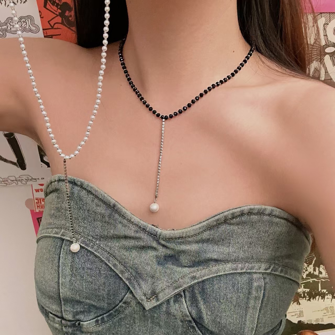 Simple Beaded Black Crystal Sexy Collarbone Chain Women's Imitation Pearl Pendant Necklace Cold Style All-match Woolen Chain for Autumn and Winter