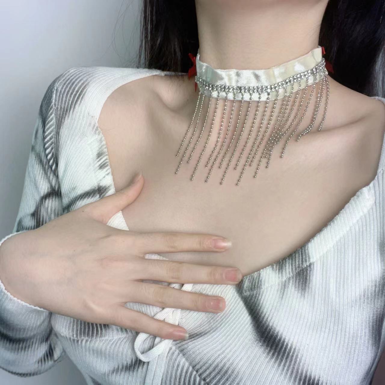Elegant Lady's Diamond-Encrusted Round Bead Tassel Fabric Necklace, Fashionable Lady's Elegant, High-End Sexy Sexy Clavicle Chain for Women