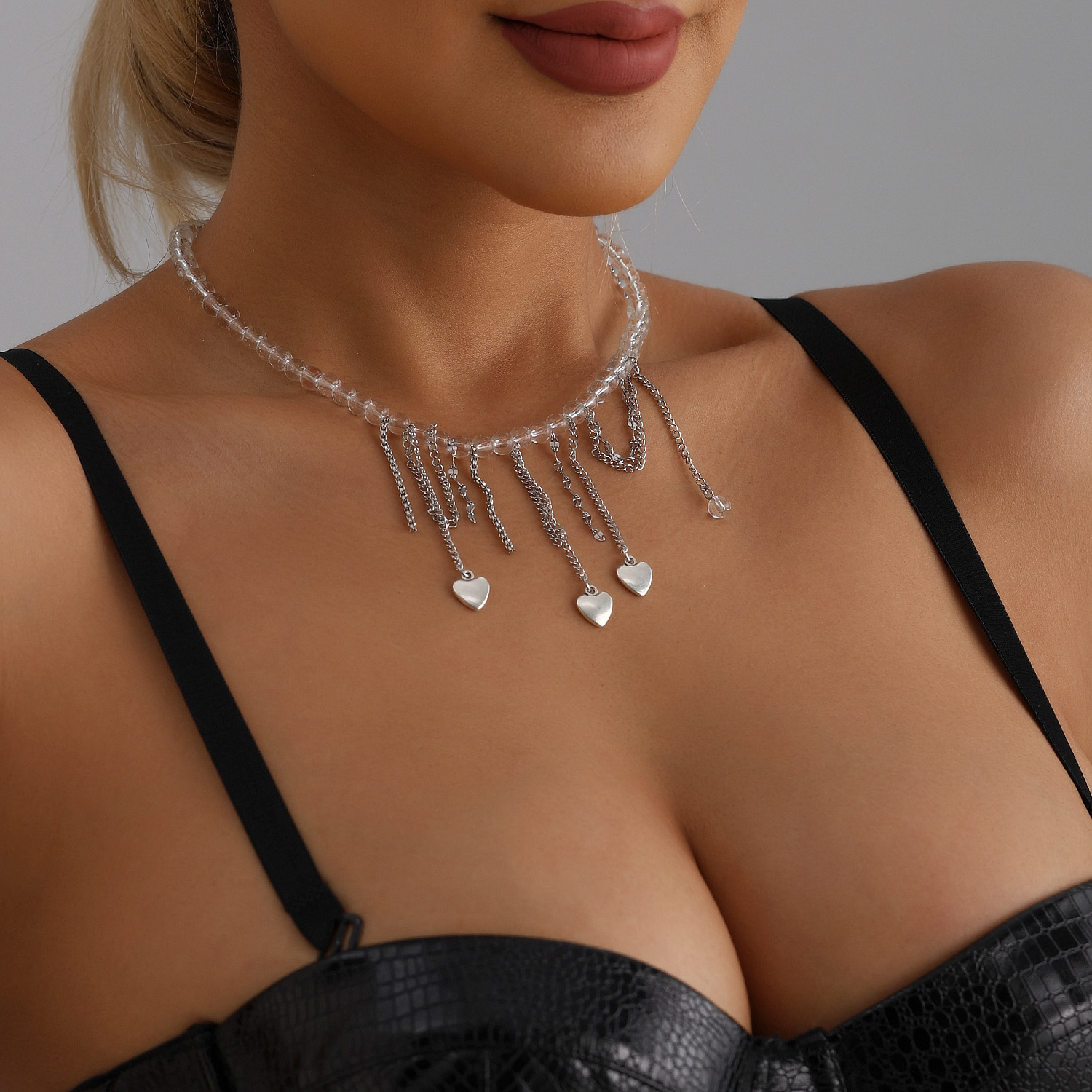 European and American Cross-Border Jewelry Ins Transparent Color Beaded Heart Tassel Pendant Neck Chain Clavicle Chain Sexy Fashion Necklace