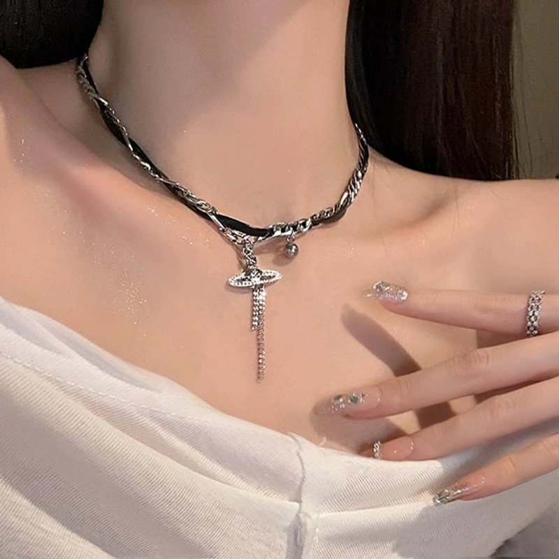 Sexy Hot girl tassel rhinestone planet surrounding necklace niche light luxury temperament personality dark black clavicle chain