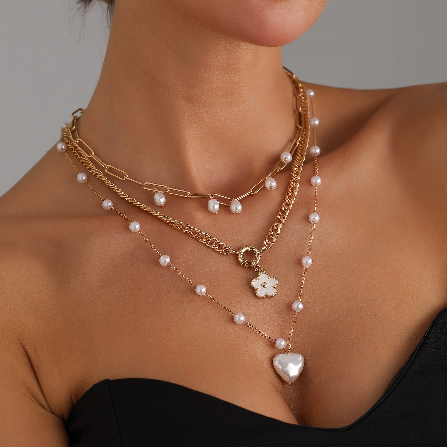 European and American Cross-Border Jewelry Popular Retro Five-Petal Flower Imitation Pearl Heart Necklace Women's Elegant and Sexy Necklace