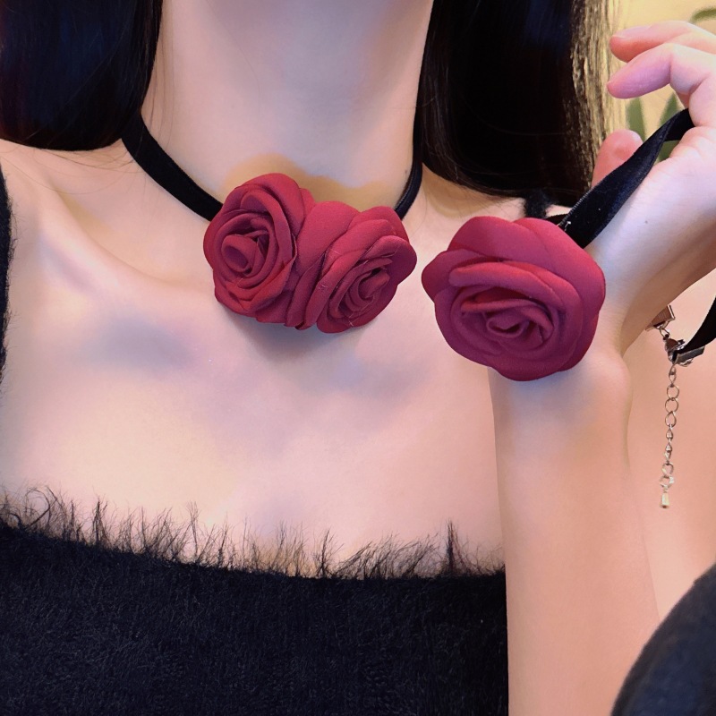 Hepburn style retro temperament niche design rose flower velvet choker clavicle chain sexy all-match necklace for women