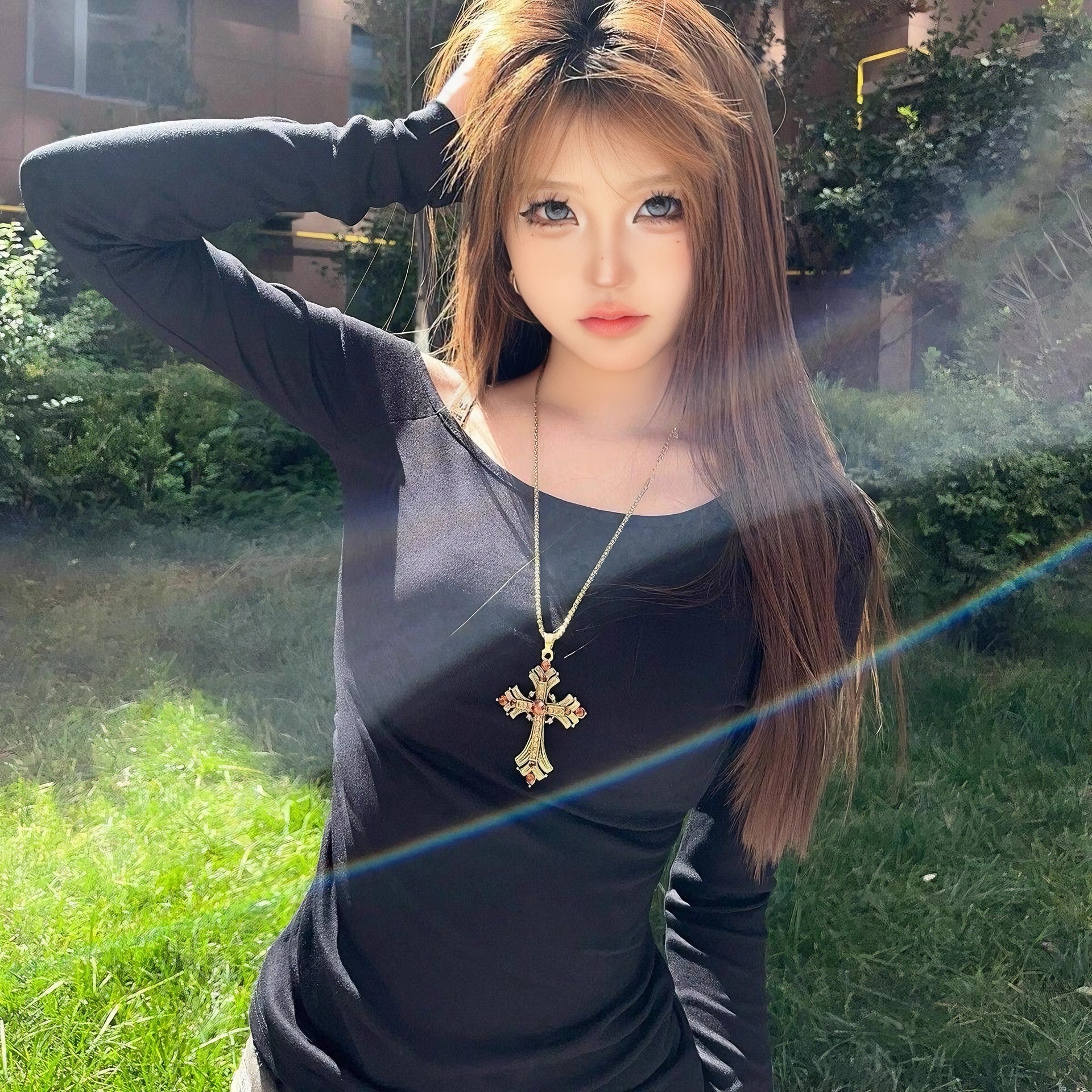 Y2k Punk Spice Girl Golden Rhinestone Cross Long Necklace Sweet Cool Wind Middle Subculture Double Layer Clavicle Chain