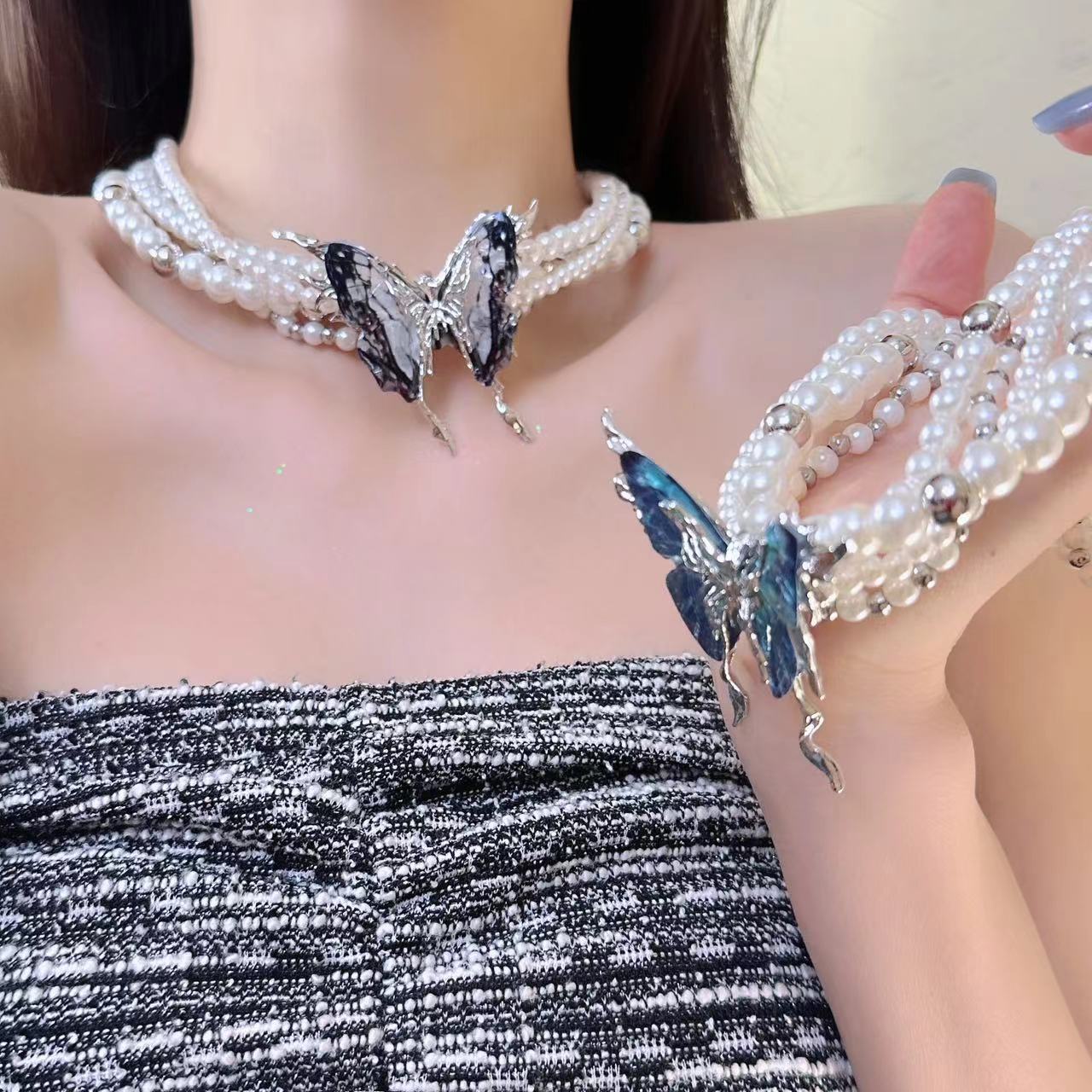 Sweet Cool Spice Style Butterfly Flow Multi-layer Sue Pearl Necklace Women Punk Y2K Culture Heavy Industry Exaggerated Necklace Tide