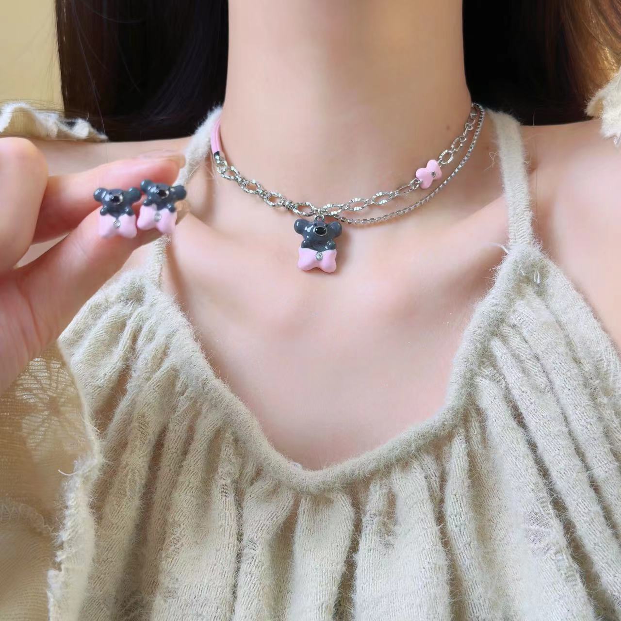 Y2K Childish Three-Dimensional Bear Necklace Spice Sweet Cool Cute Sub-cultural Niche Design Exquisite Earrings Clavicle Chain