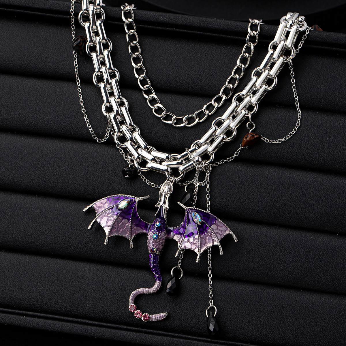 Y2K Chinese Punk Sweet Cool Metal Chain Heavy-Duty Multi-Layer Necklace Purple Flying Dragon Pendant Collarbone Subculture