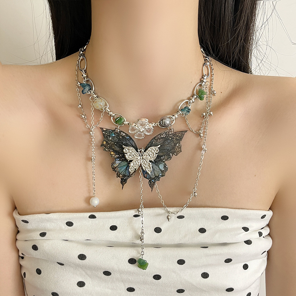 Y2K Blue Purple Butterfly Tassel Necklace Spice Sweet Cool Asian Culture Heavy Clavicle Chain Niche High-grade Exaggerated Necklace