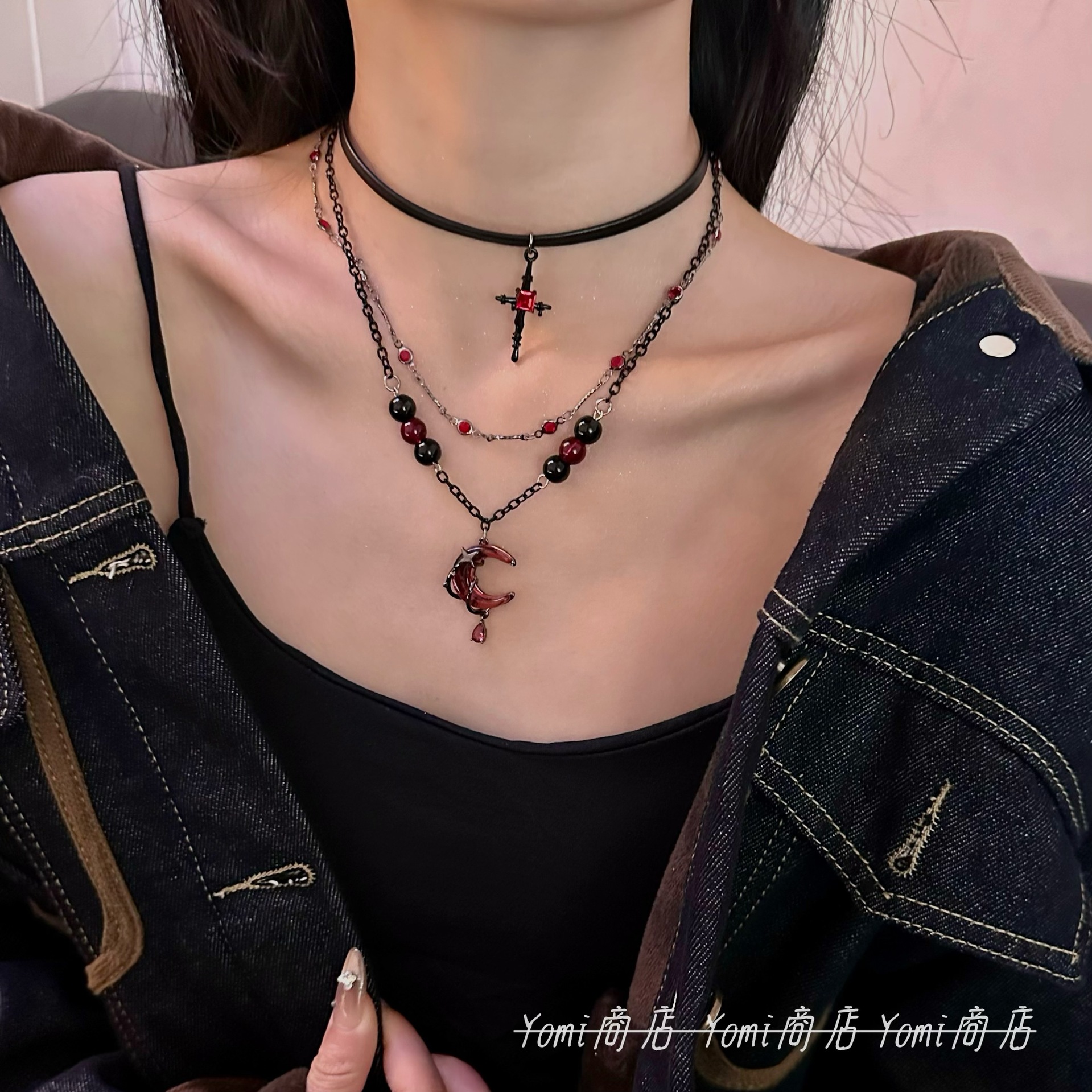 Scarlet Crescent Cross Choker Necklace Women's Dark Gothic Subculture Overlapping Clavicle Chain Accessories Trendy