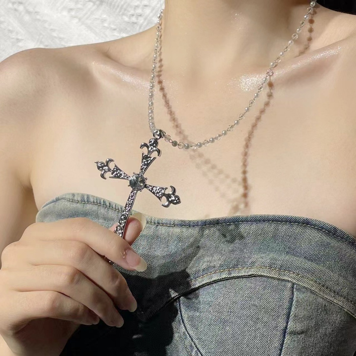 Retro Dark Style Cross Necklace Subculture Gothic Style Long Diamond Sweater Chain Niche Sweet and Cool Clavicle Chain