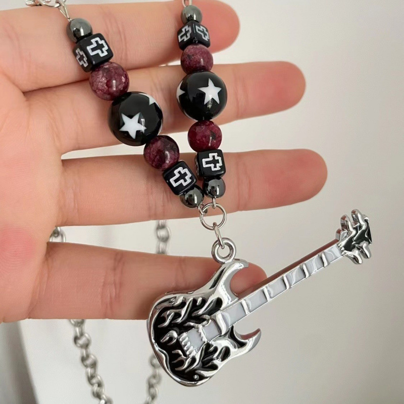 Punk Rock Dark Flame Guitar Necklace Star Five-Pointed Star Retro Y2K Sexy Subculture Ins Style Hanging Chain