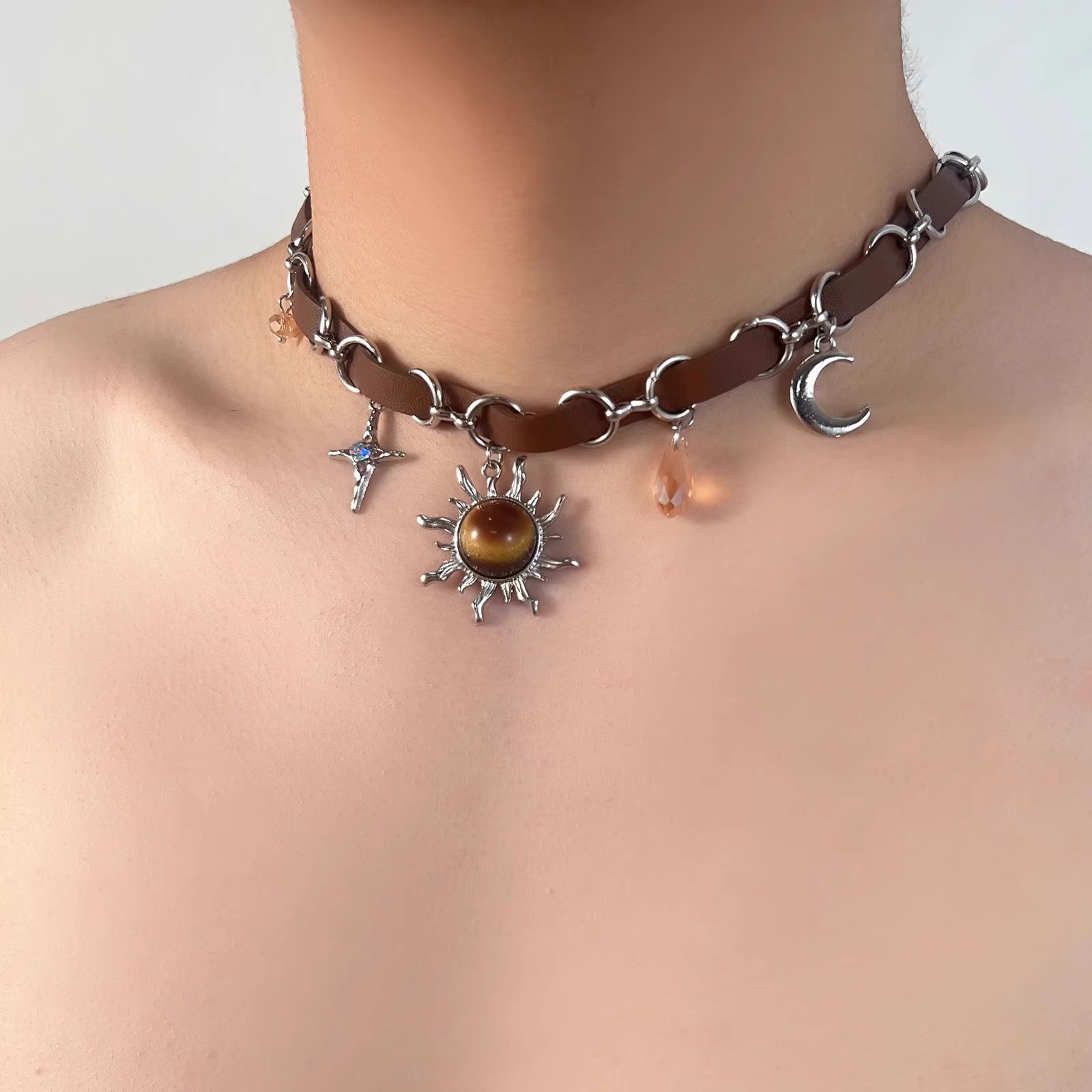 Subculture Y2K Meteorite Starburst Necklace Female Unisex Punk Five-Pointed Star Leather Clavicle Chain Hardcore Punk Style