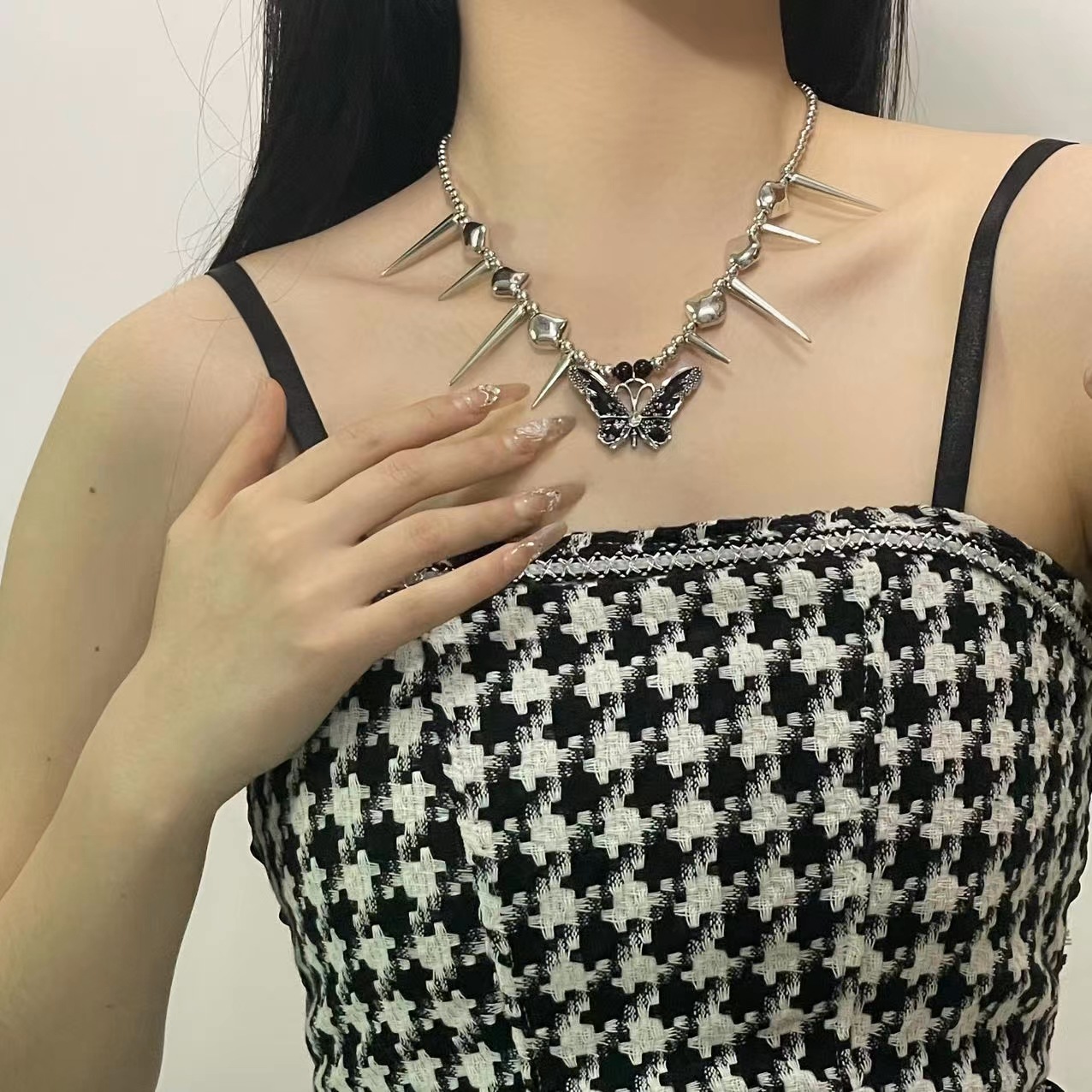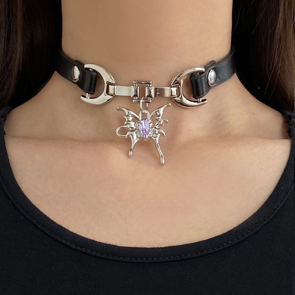 Dark Style Leather Metal Diamond Butterfly Pendant Necklace Female Sweet Cool Sexy Subculture Necklace Ins Clavicle Chain