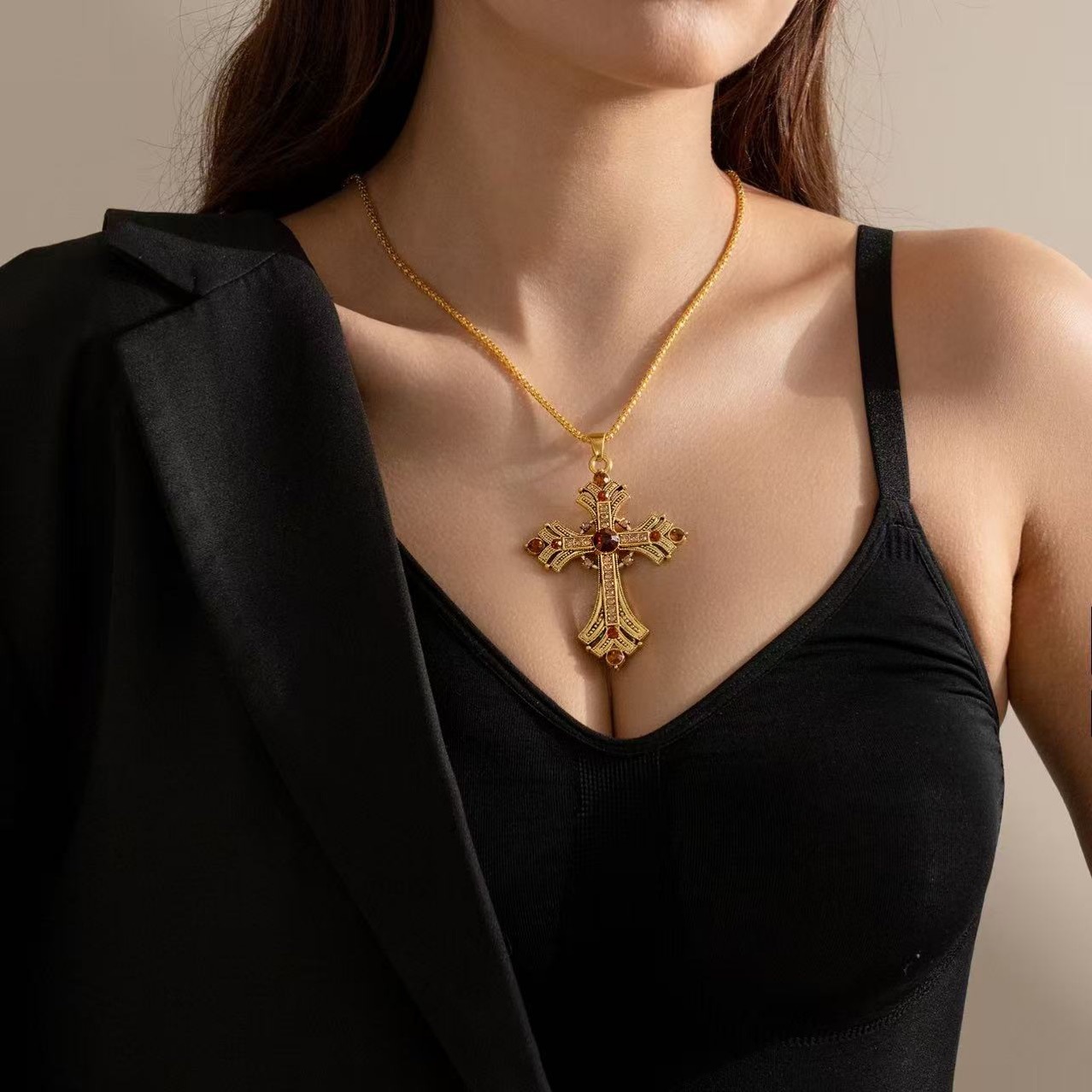 Golden Middle Ancient Asian Culture Cross Rhinestone Necklace Millennium Sweet Cool Style Long Collarbone Chain Spice Girl