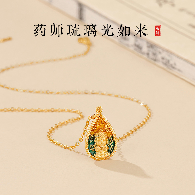 New Style Chinese Style Culture Blessing Buddha and Fated Medicine Teacher Buddha Necklace Burned Blue Ancient Gold Plated Pendant Glue Dropping Clavicle Chain