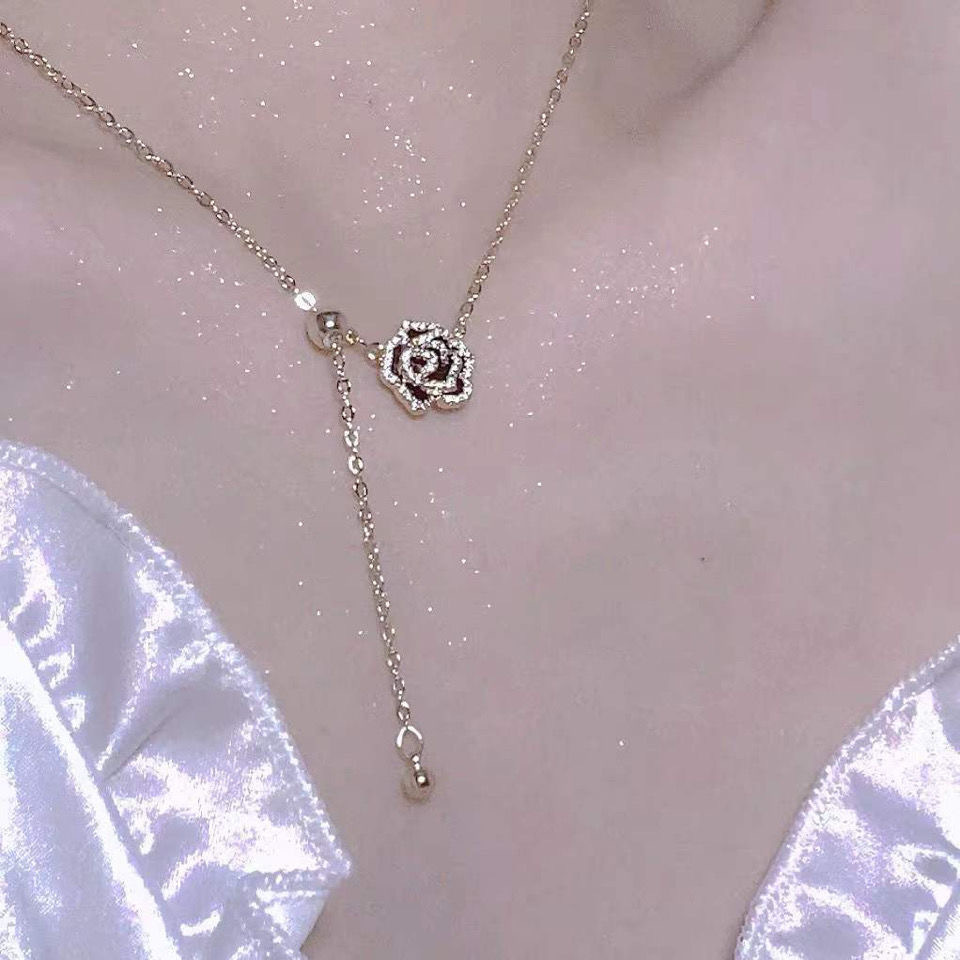 French Gentle ~ Black Tea Flower Necklace Women's ins Trendy Niche Design Feeling Elegant Retro Diamond Necklace Clavicle Chain Women