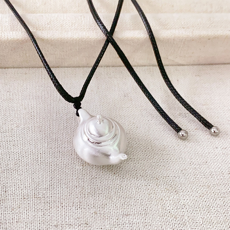 Autumn and Winter New Brushed Silver Teapot Leather Cord Long Necklace Pendant Adjustable Niche Versatile Fashion Sweater Chain