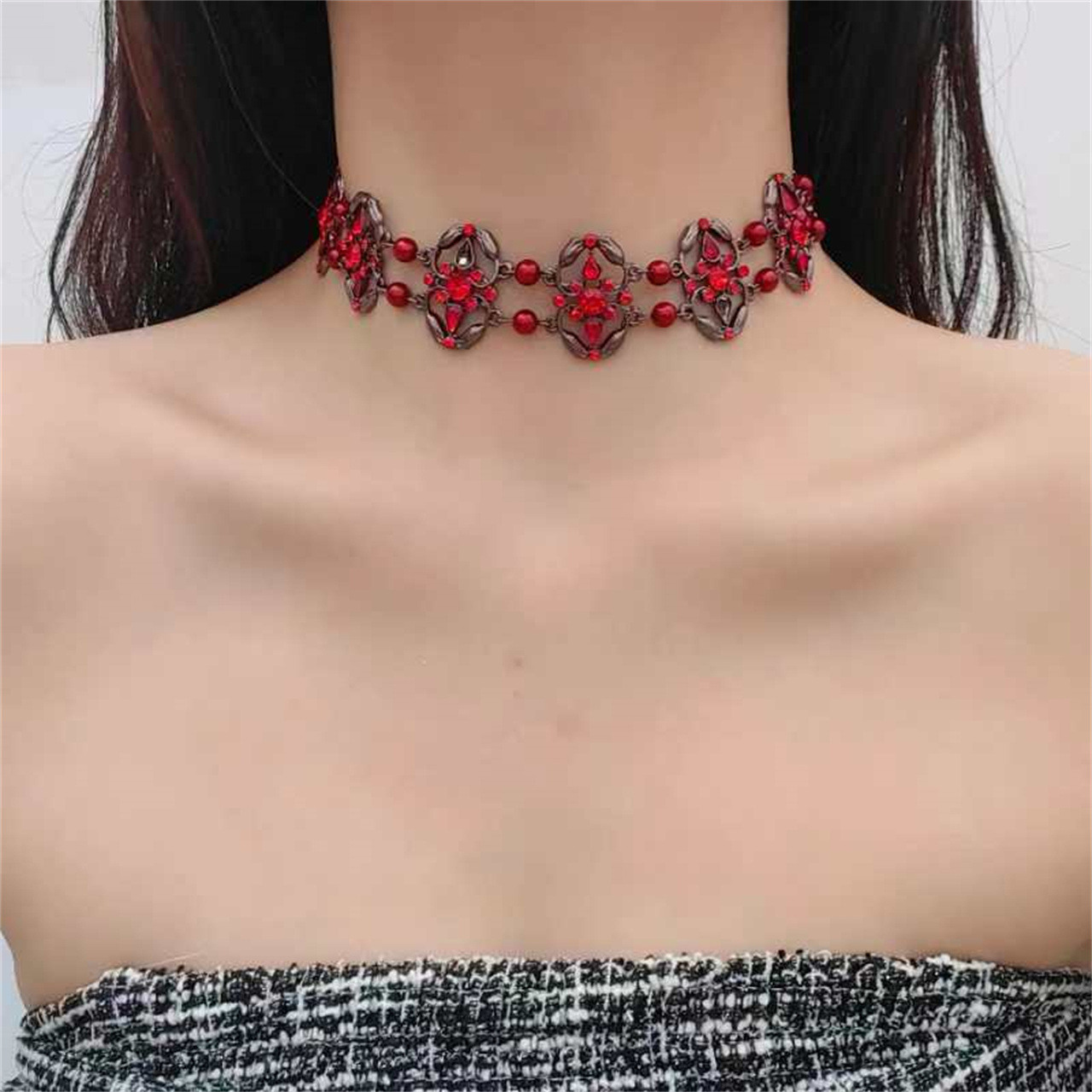 Choker Red Crystal Pearl Punk Necklace Heavy Industry Red Black Gothic Hip Hop High Street Collar Subculture Accessories