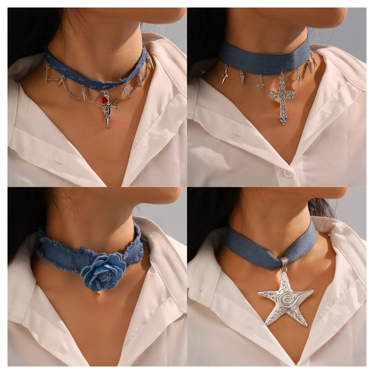 NZ3099 Cross-border Subculture Punk Heavy Industries Blue Denim Beaded Necklace Women's chocker Necklace Women's Collar