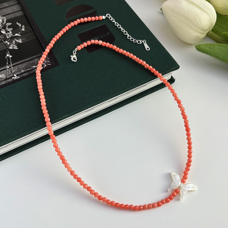 925 Sterling Silver Red Coral Stone Beaded Shell Butterfly Necklace Women Sweet Fashion High Sense Clavicle Chain N0569