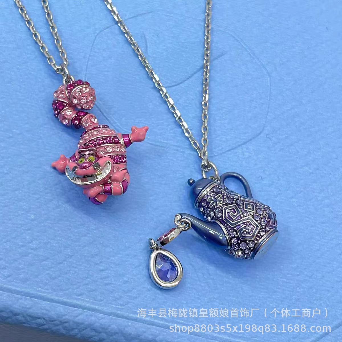 Shijia Alice in Wonderland Teapot Pendant Necklace for Women Wonderland Pink Sparkling Cat Water Drop Clavicle Chain