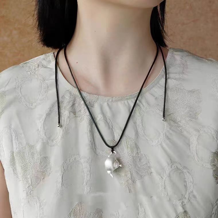 25 New Brushed Teapot Black Leather Rope Pendant Niche Simple Design Necklace Fashion Versatile Personality Clavicle Chain