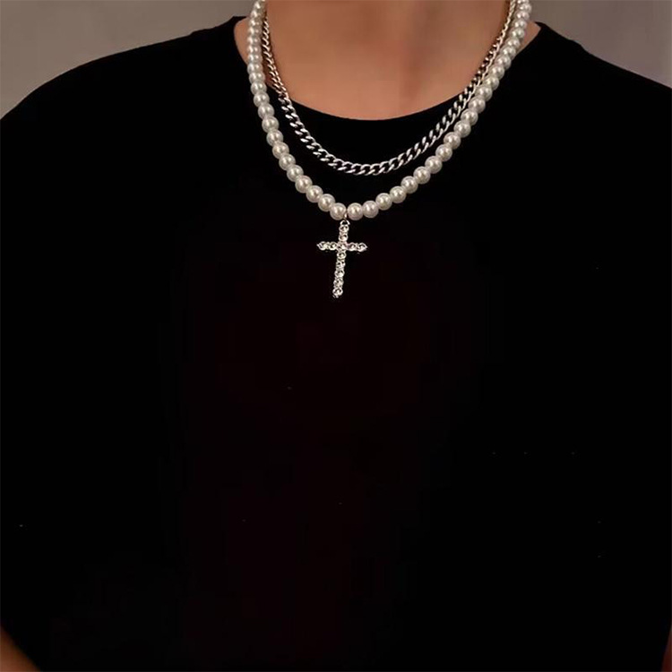 Ins European and American Hip-Hop Niche High-End Full Diamond Cross Spliced Pearl Necklace Unisex Punk Personality Accessories